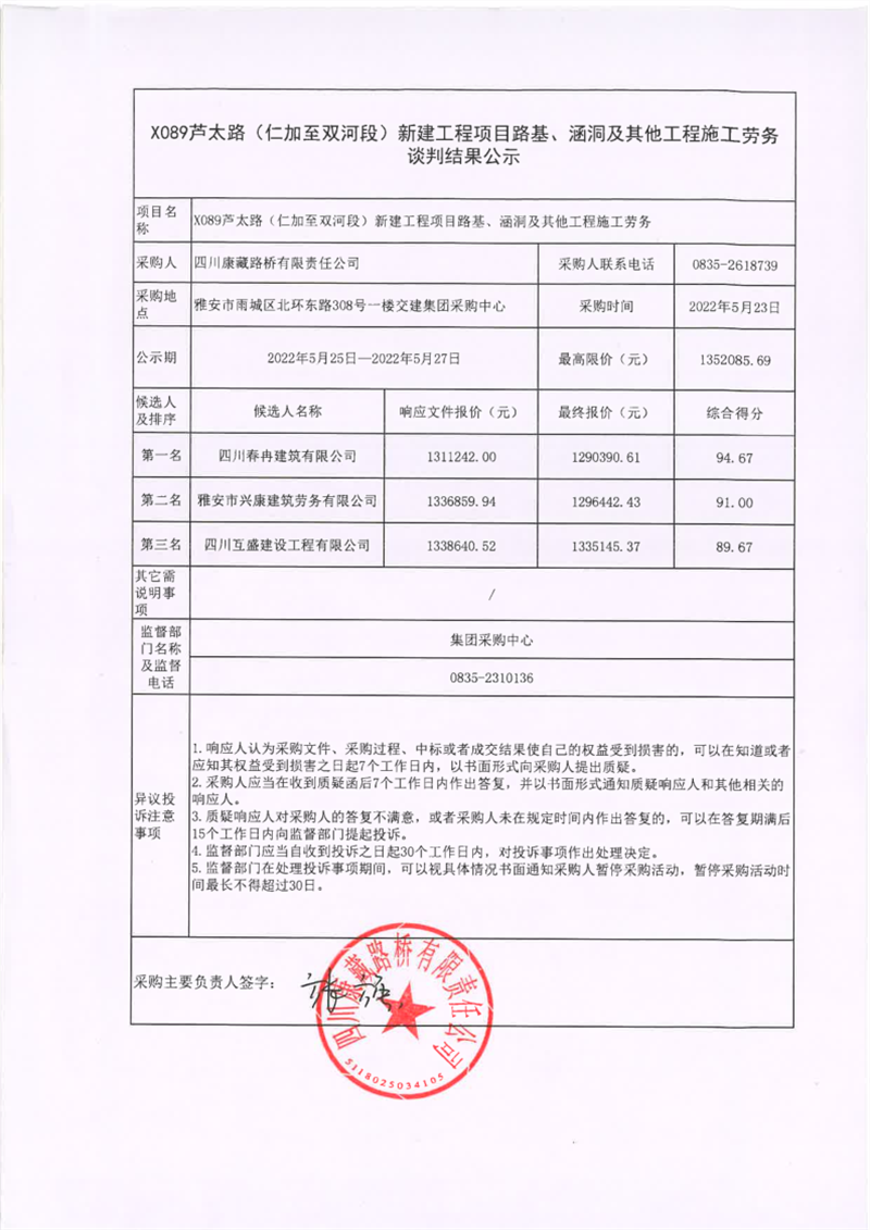 四川康藏路橋有限責(zé)任公司X089蘆太路(仁加至雙河段)新建工程項(xiàng)目路基、涵洞及其他工程施工勞務(wù)談判結(jié)果公示