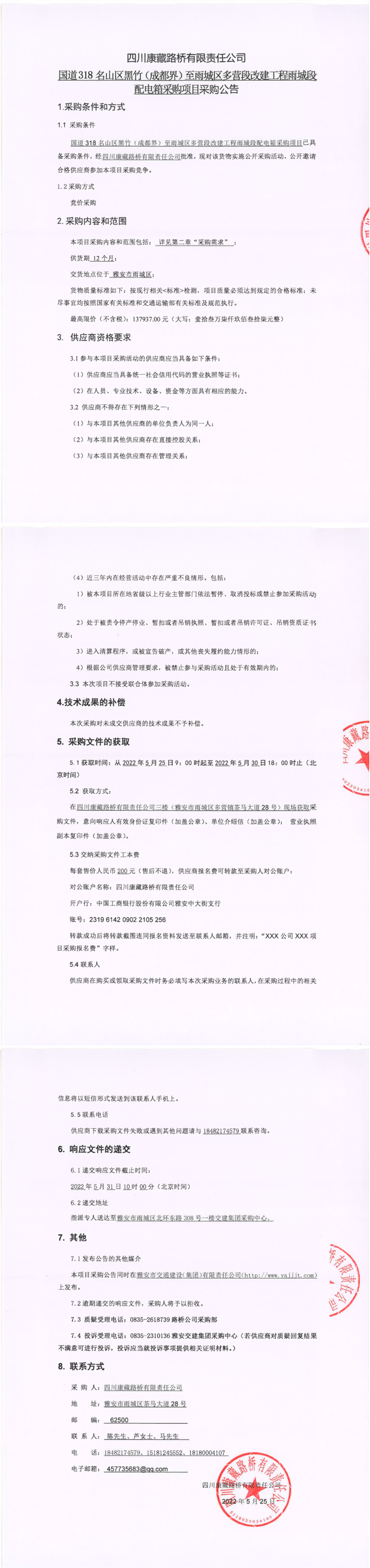 四川康藏路橋有限責(zé)任公司國(guó)道318名山區(qū)黑竹(成都界)至雨城區(qū)多營(yíng)段改建工程雨城段配電箱采購(gòu)項(xiàng)目采購(gòu)公告
