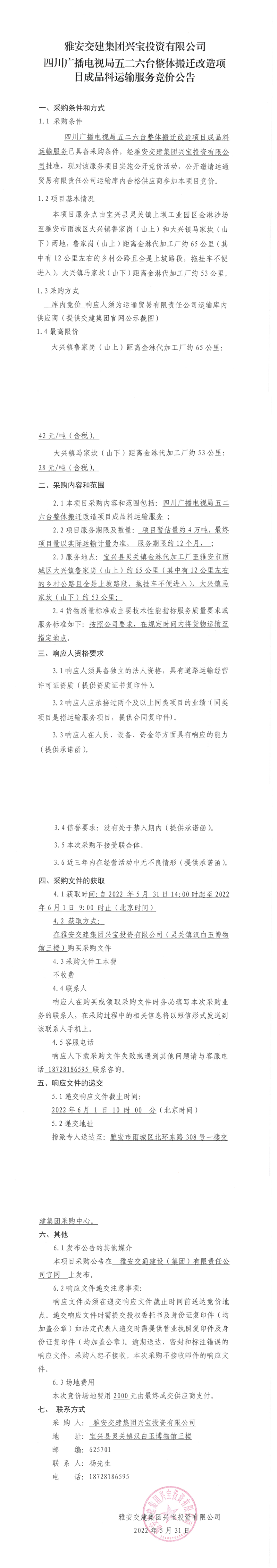 雅安交建集團(tuán)興寶投資有限公司四川廣播電視局五二六臺整體搬遷改造項(xiàng)目成品料運(yùn)輸服務(wù)競價(jià)公告