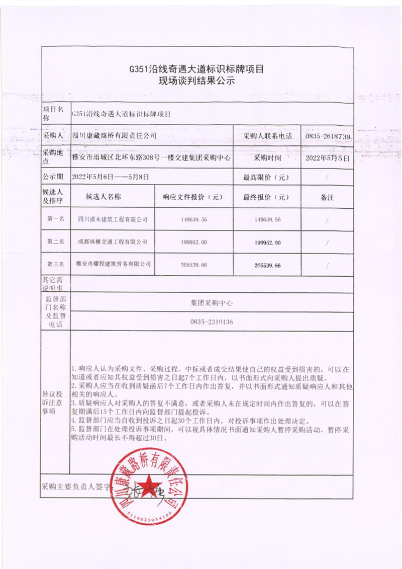 四川康藏路橋有限責任公司G351沿線奇遇大道標識標牌項目現(xiàn)場談判結果公示