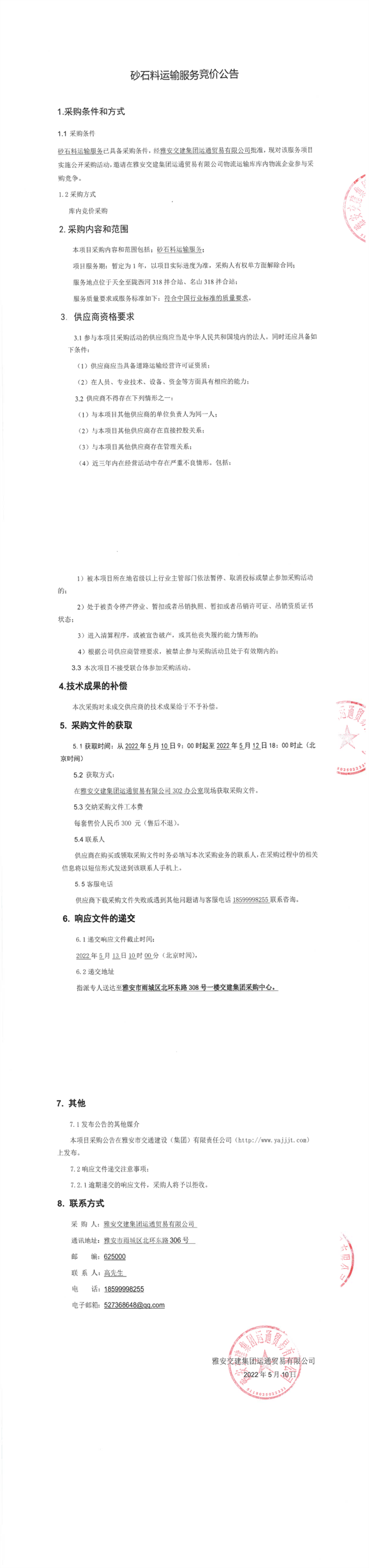 雅安交建集團(tuán)運(yùn)通貿(mào)易有限公司砂石料運(yùn)輸服務(wù)競價(jià)公告