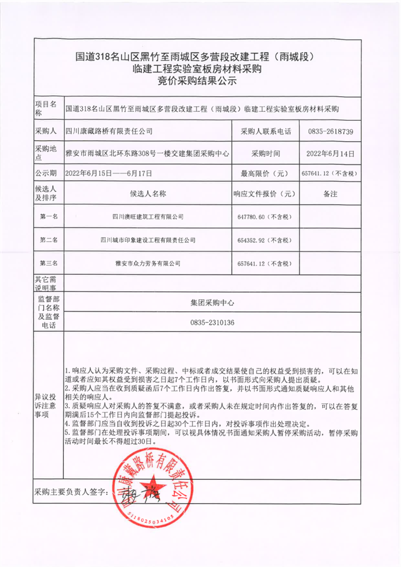 四川康藏路橋有限責(zé)任公司國道318名山區(qū)黑竹至雨城區(qū)多營段改建工程(雨城段)臨建工程實驗室板房材料采購競價采購結(jié)果公示