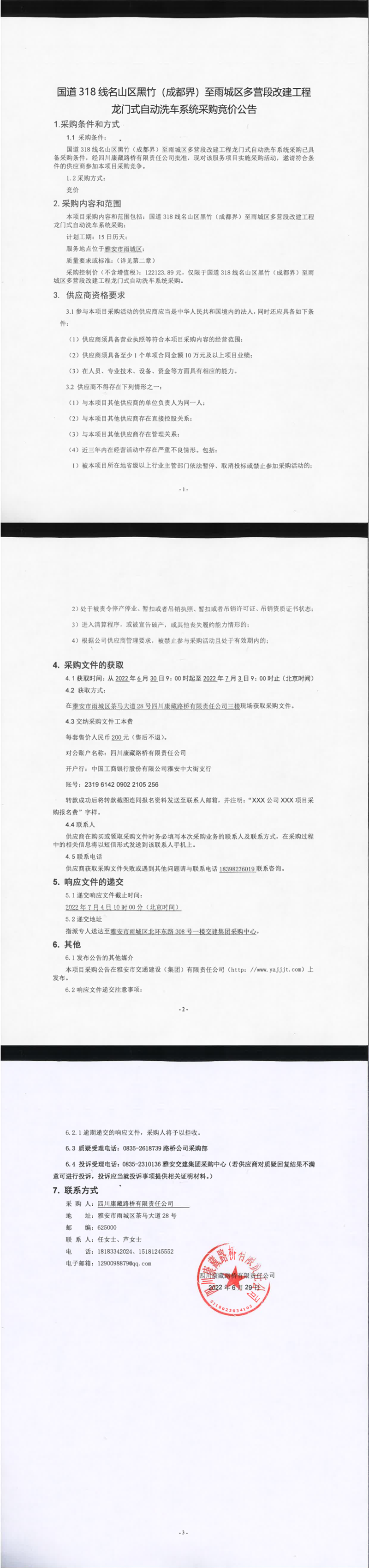 四川康藏路橋有限責(zé)任公司國道318線名山區(qū)黑竹(成都界)至雨城區(qū)多營段改建工程龍門式自動(dòng)洗車系統(tǒng)采購競(jìng)價(jià)公告