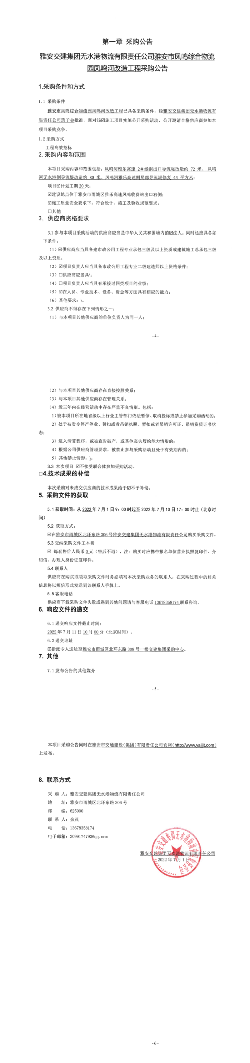 雅安交建集團(tuán)無水港物流有限責(zé)任公司雅安市鳳鳴綜合物流園鳳鳴河改造工程采購(gòu)公告
