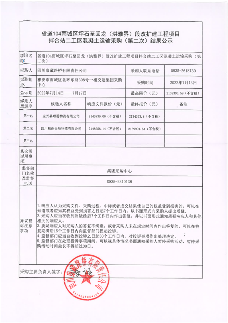 四川康藏路橋有限責(zé)任公司省道104線雨城區(qū)坪石至回龍(洪雅界)段改擴(kuò)建工程項(xiàng)目拌合站二工區(qū)混凝土運(yùn)輸采購(第二次)結(jié)果公示