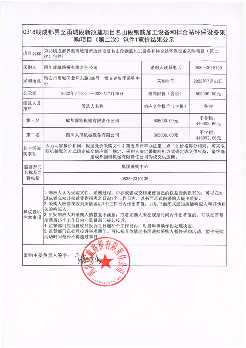 四川康藏路橋有限責(zé)任公司G318線成都界至雨城段新改建項(xiàng)目名山段鋼筋加工設(shè)備和拌合站環(huán)保設(shè)備采購(gòu)項(xiàng)目(第二次)包件1競(jìng)價(jià)結(jié)果公示