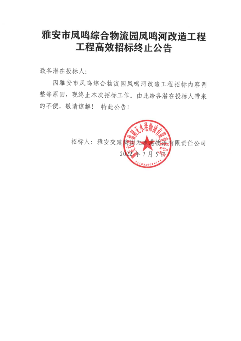雅安交建集團無水港物流有限責任公司雅安市鳳鳴綜合物流園鳳鳴河改造工程高效招標終止公告