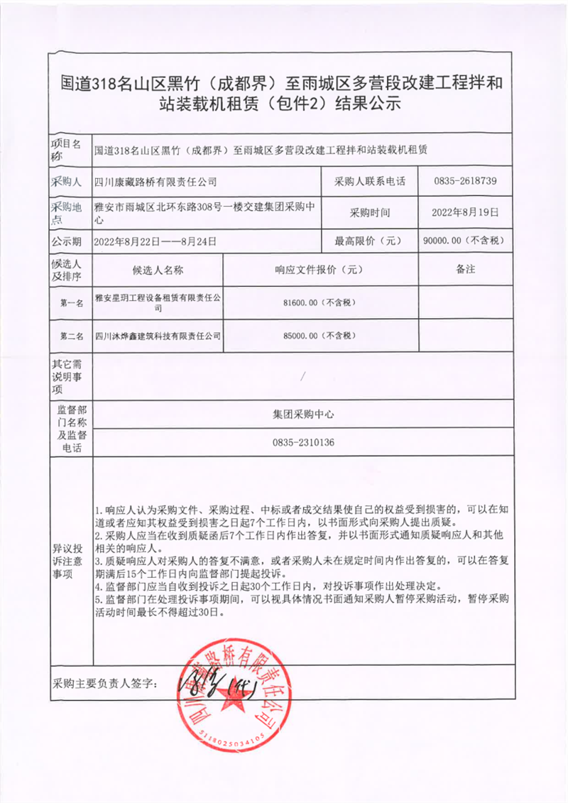 四川康藏路橋有限責(zé)任公司國道318名山區(qū)黑竹(成都界)至雨城區(qū)多營段改建工程拌和站裝載機租賃(包件2)結(jié)果公示
