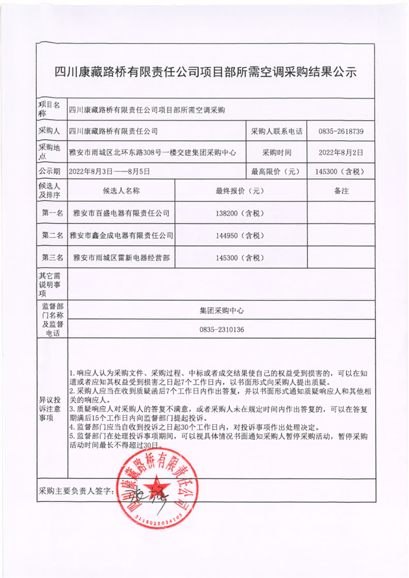 四川康藏路橋有限責任公司項目部所需空調采購結果公示
