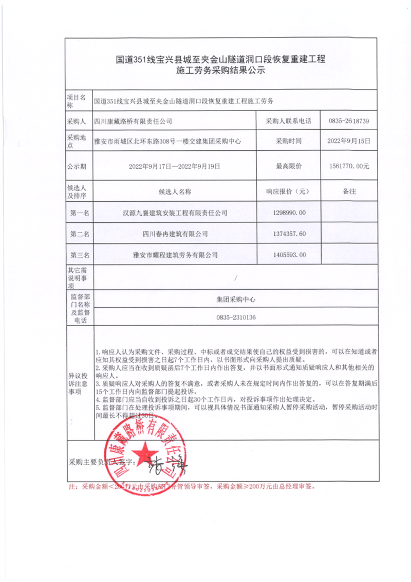 四川康藏路橋有限責(zé)任公司國(guó)道351線寶興縣城至夾金山隧道洞口段恢復(fù)重建工程施工勞務(wù)采購(gòu)結(jié)果公示