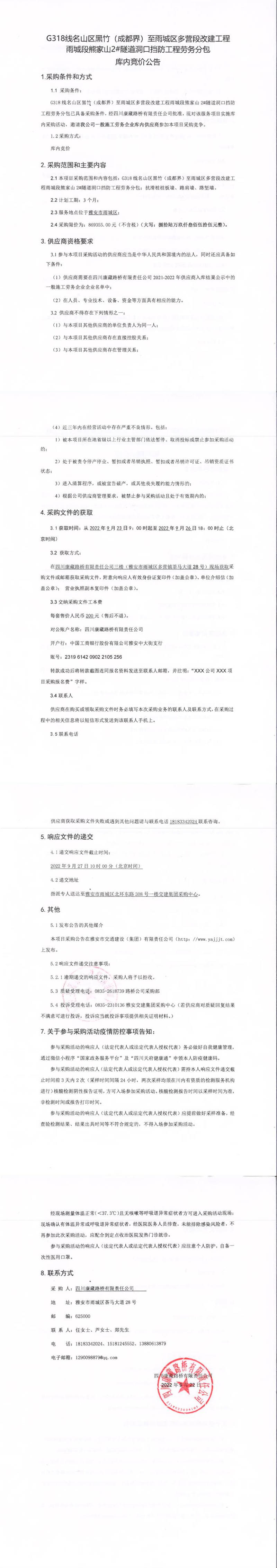 四川康藏路橋有限責任公司G318線名山區(qū)黑竹(成都界)至雨城區(qū)多營段改建工程雨城段熊家山2#隧道洞口擋防工程勞務分包庫內(nèi)競價公告