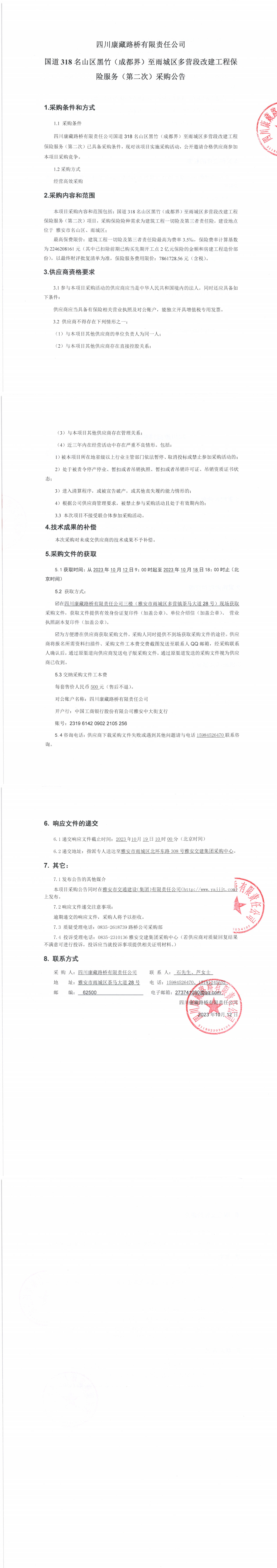 四川康藏路橋有限責任公司國道318名山區(qū)黑竹(成都界)至雨城區(qū)多營段改建工程保險服務(wù)(第二次)采購公告