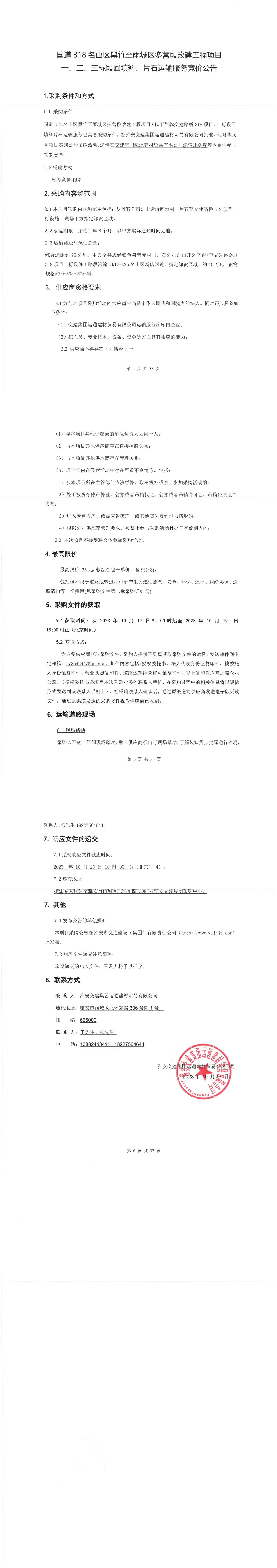 雅安交建集團運通建材貿易有限公司國道名山區(qū)黑竹至雨城區(qū)多營段改建工程項目一、二、三標段回填料、片石運輸服務競價公告
