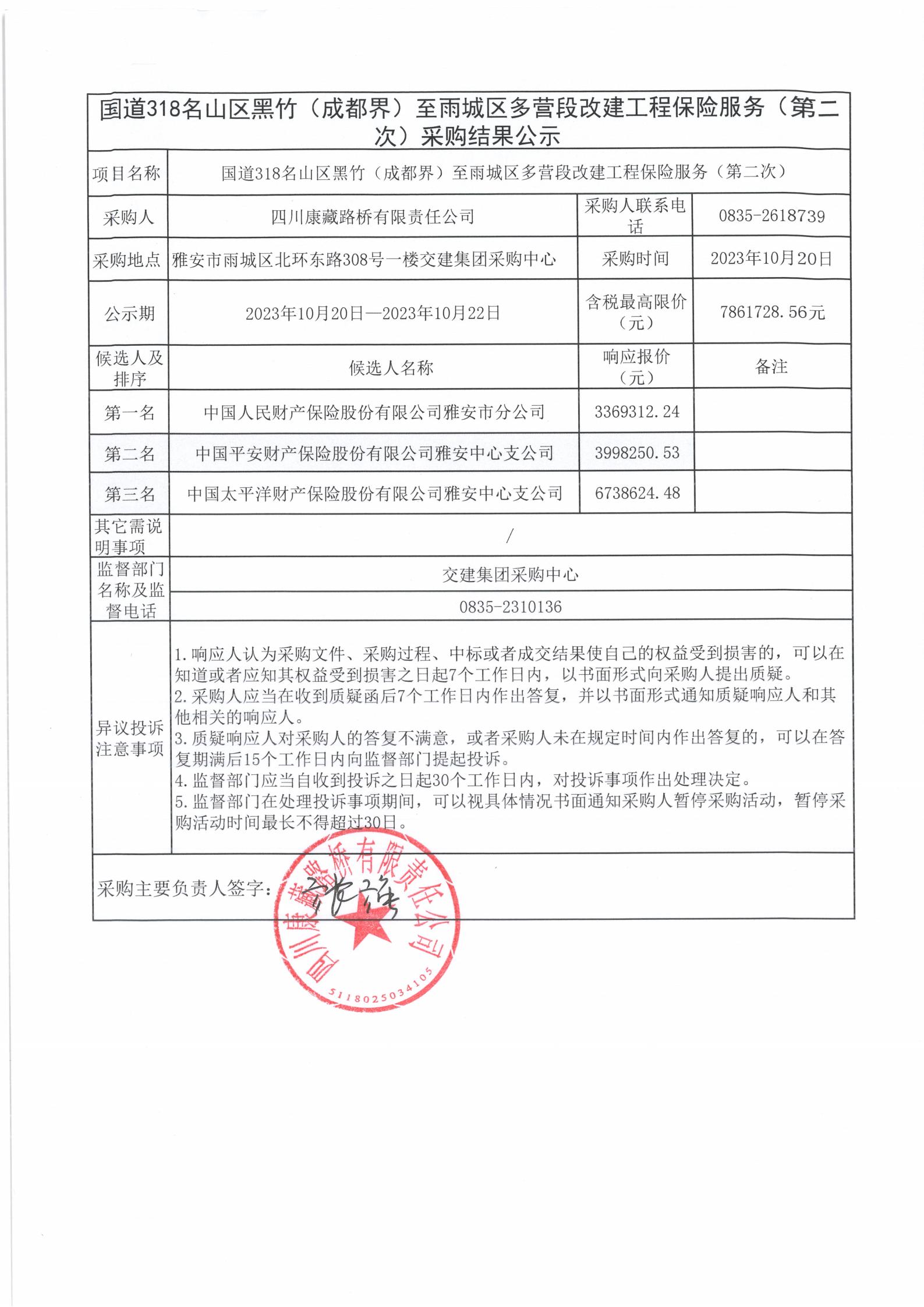 四川康藏路橋有限責(zé)任公司國道318名山區(qū)黑竹(成都界)至雨城區(qū)多營(yíng)段改建工程保險(xiǎn)服務(wù)(第二次)采購結(jié)果公示