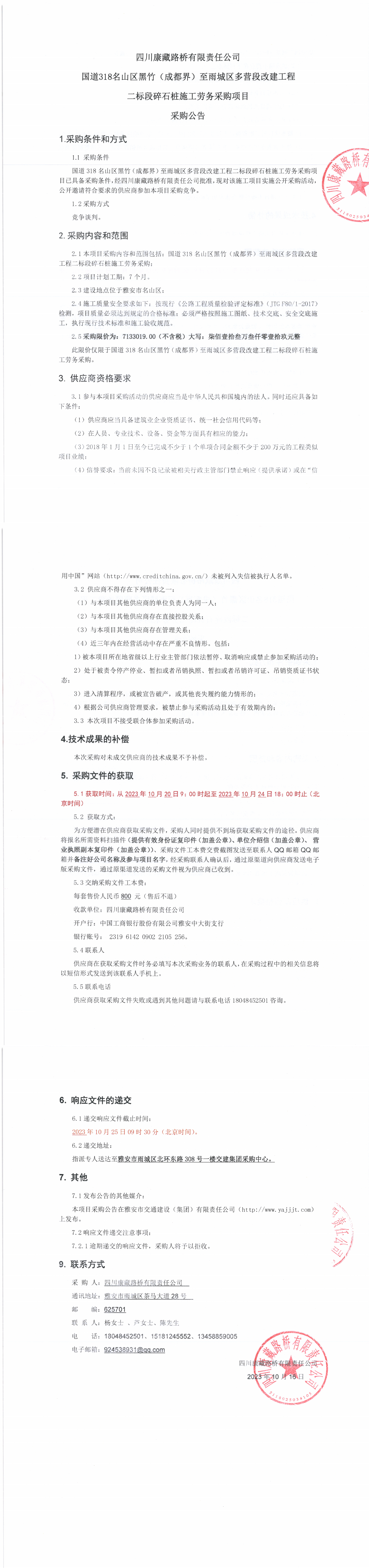 四川康藏路橋有限責任公司國道318名山區(qū)黑竹(成都界)至雨城區(qū)多營段改建工程二標段碎石樁施工勞務(wù)采購項目采購公告