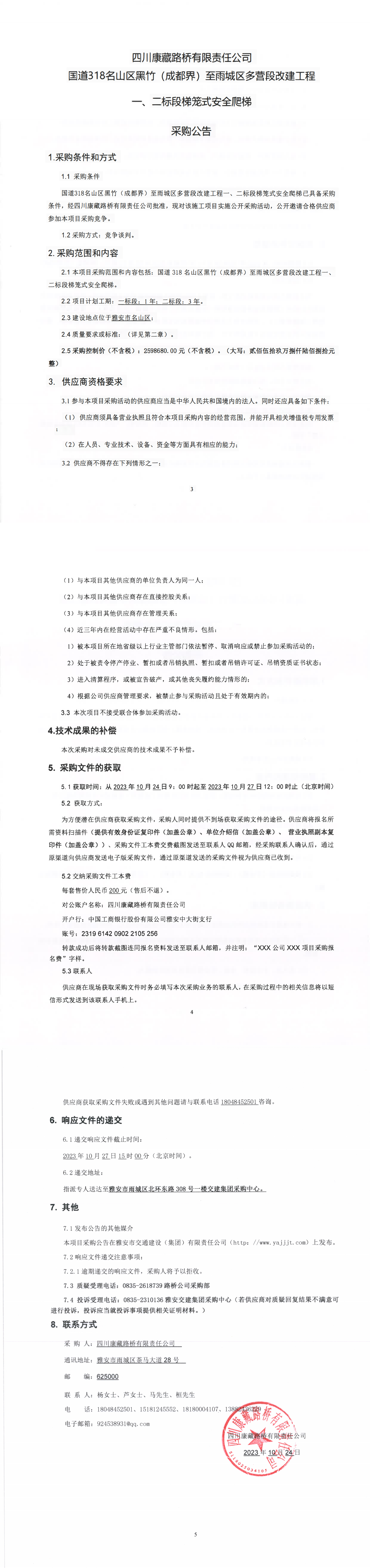 四川康藏路橋有限責(zé)任公司國(guó)道318名山區(qū)黑竹(成都界)至雨城區(qū)多營(yíng)段改建工程一、二標(biāo)段梯籠式安全爬梯采購(gòu)公告