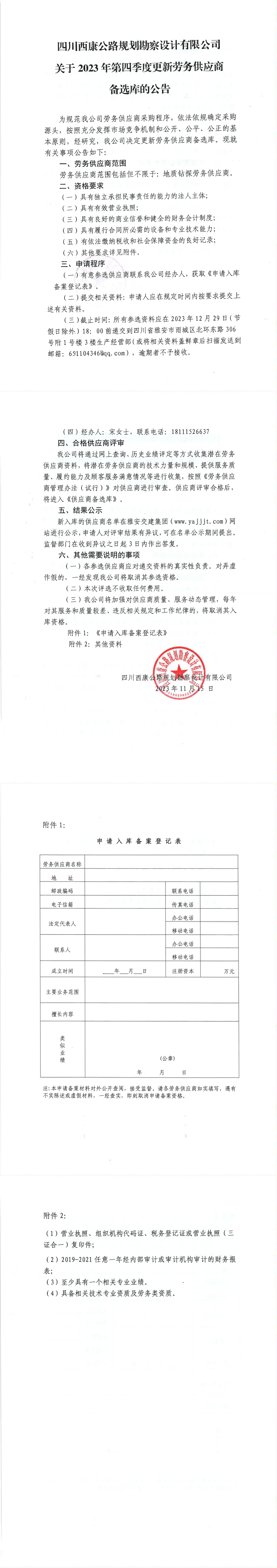 四川西康公路規(guī)劃勘察設(shè)計(jì)有限公司關(guān)于2023年第四季度更新勞務(wù)供應(yīng)商備選庫的公告