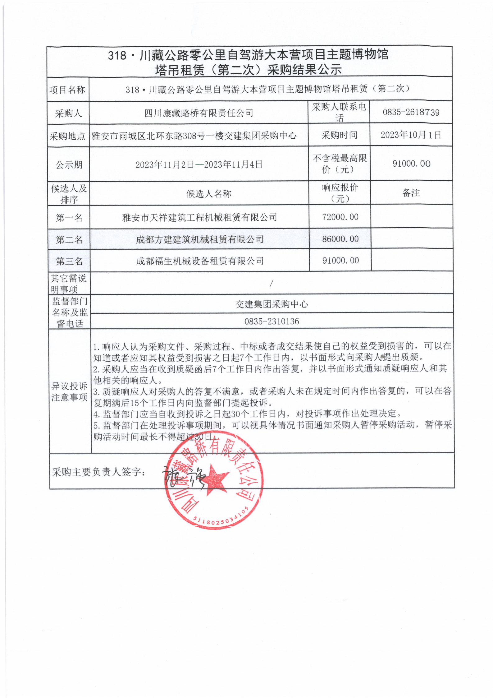 四川康藏路橋有限責任公司318·川藏公路零公里自駕游大本營項目主題博物館塔吊租賃(第二次)采購結(jié)果公示