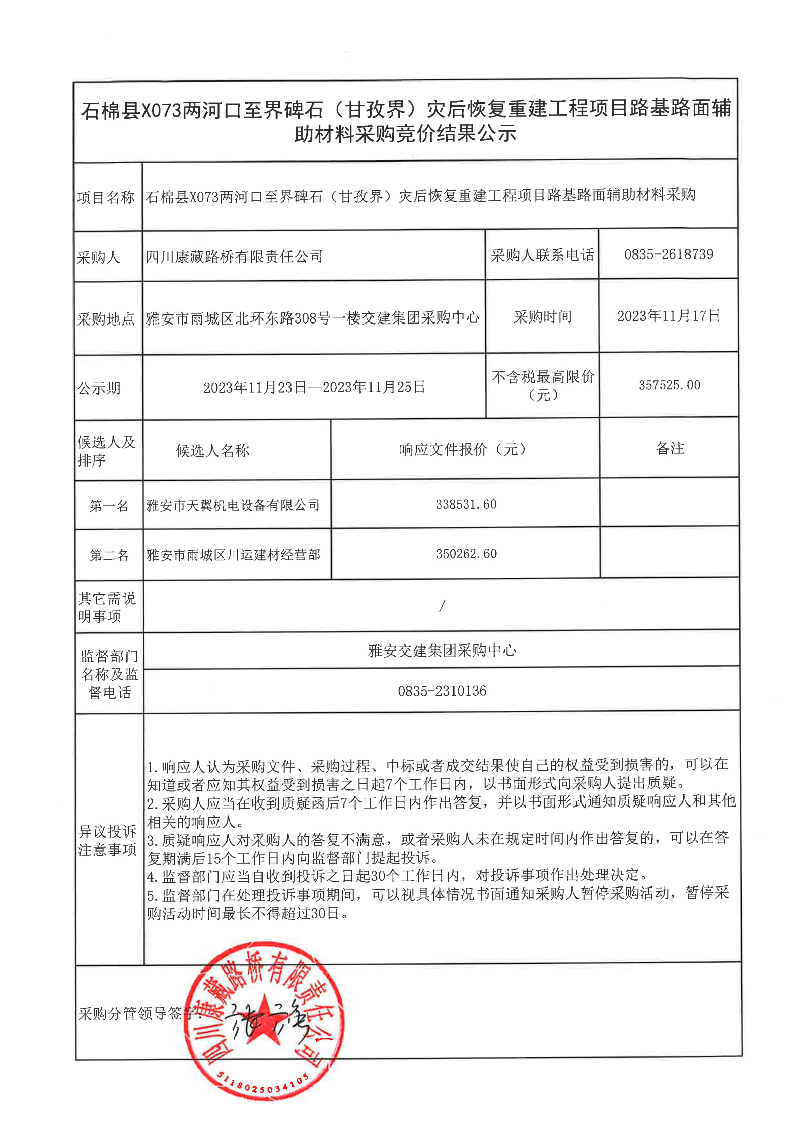 四川康藏路橋有限責(zé)任公司石棉縣X073兩河口至界碑石(甘孜界)災(zāi)后恢復(fù)重建工程項目路基路面輔助材料采購結(jié)果公示