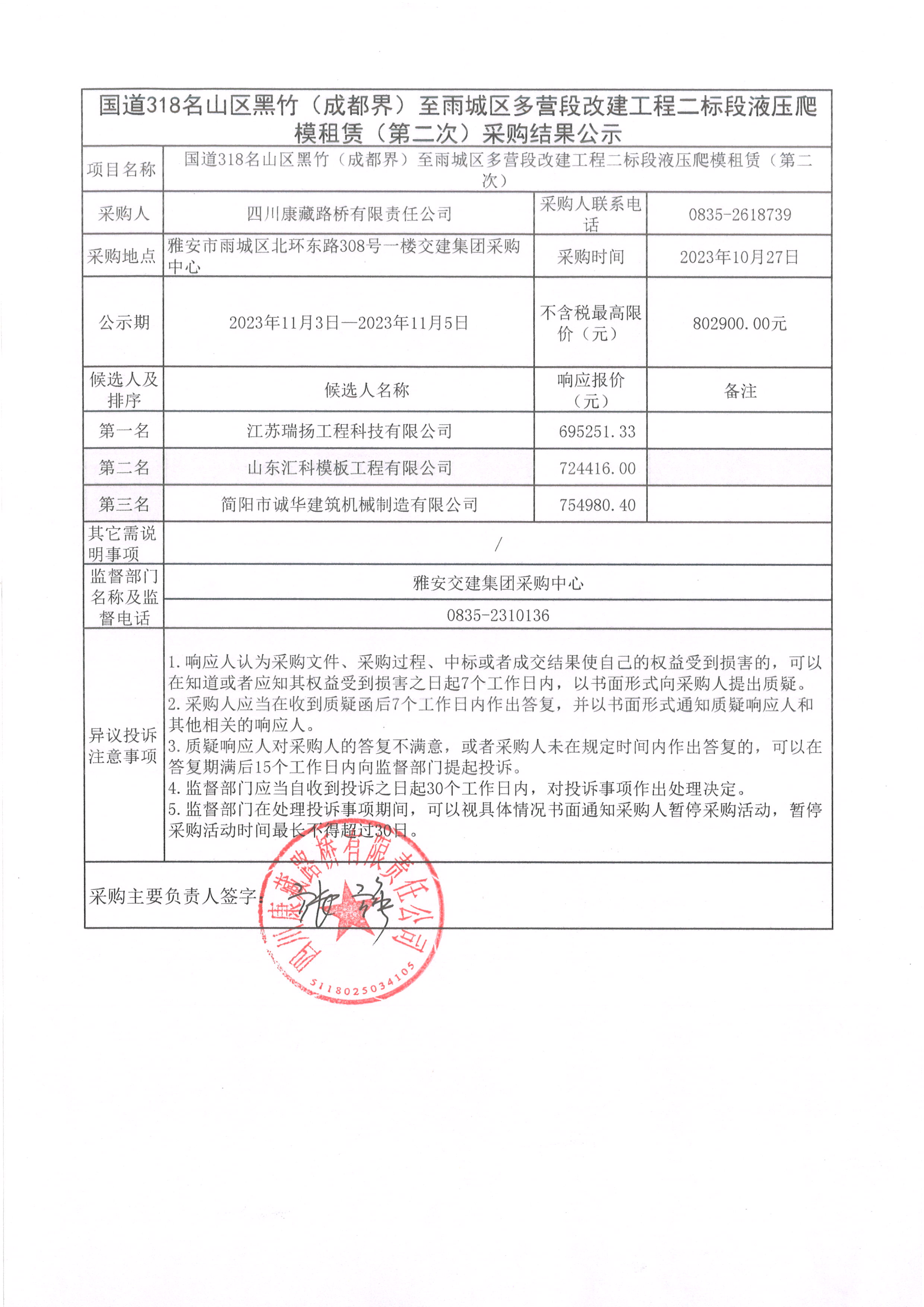 四川康藏路橋有限責任公司國道318名山區(qū)黑竹(成都界)至雨城區(qū)多營段改建工程二標段液壓爬模租賃(第二次)采購結(jié)果公示