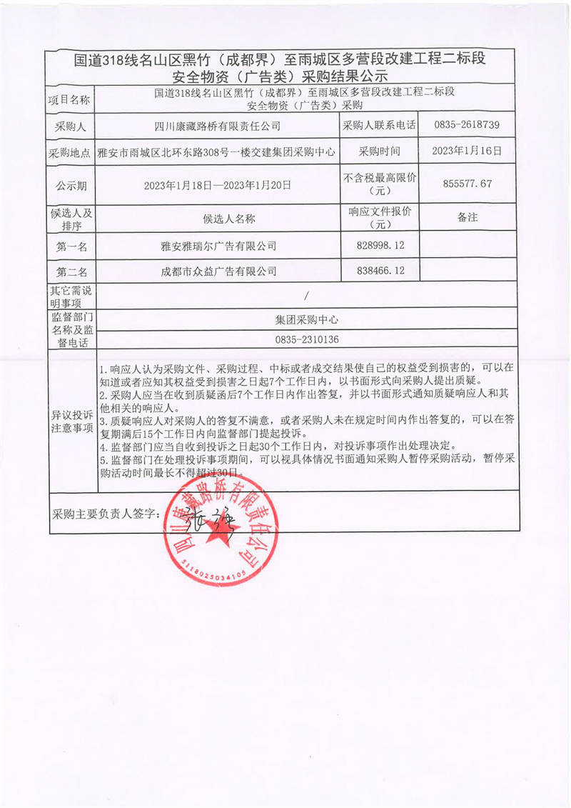 四川康藏路橋有限責(zé)任公司國(guó)道318線(xiàn)名山區(qū)黑竹(成都界)至雨城區(qū)多營(yíng)段改建工程二標(biāo)段安全物資(廣告類(lèi))采購(gòu)結(jié)果公示