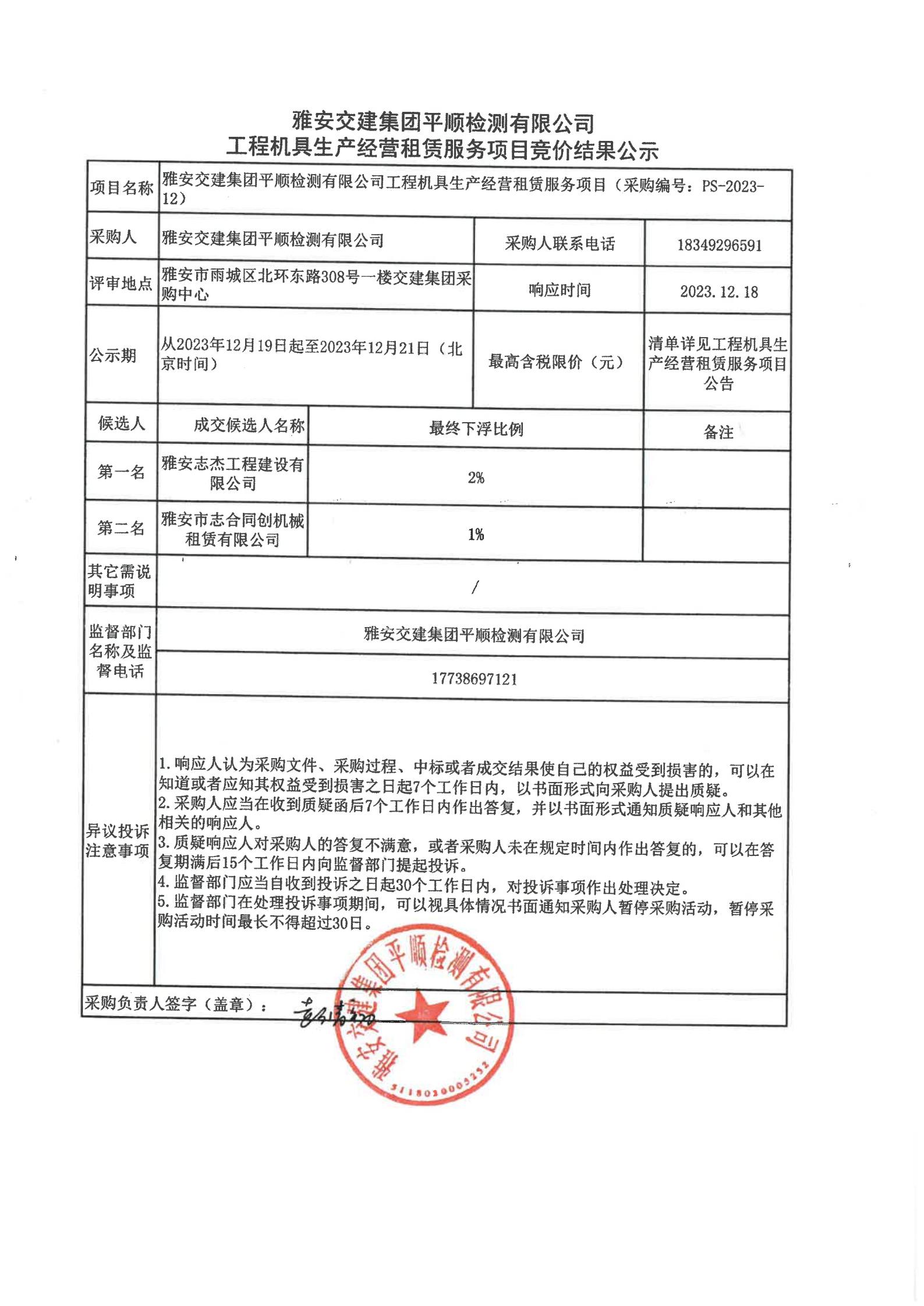 雅安交建集團(tuán)平順檢測有限公司工程機(jī)具生產(chǎn)經(jīng)營租賃服務(wù)項目競價結(jié)果公示