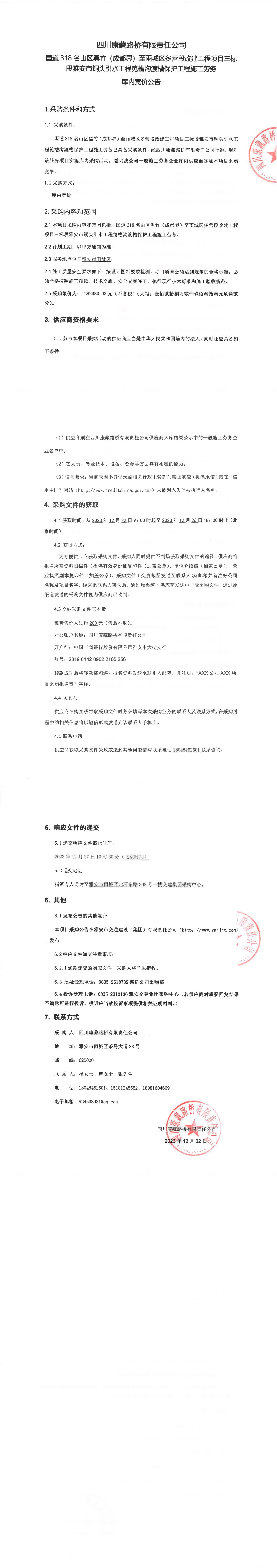 四川康藏路橋有限責任公司國道318名山區(qū)黑竹(成都界)至雨城區(qū)多營段改建工程項目三標段雅安市銅頭引水工程筧槽溝渡槽保護工程施工勞務庫內(nèi)競價公告