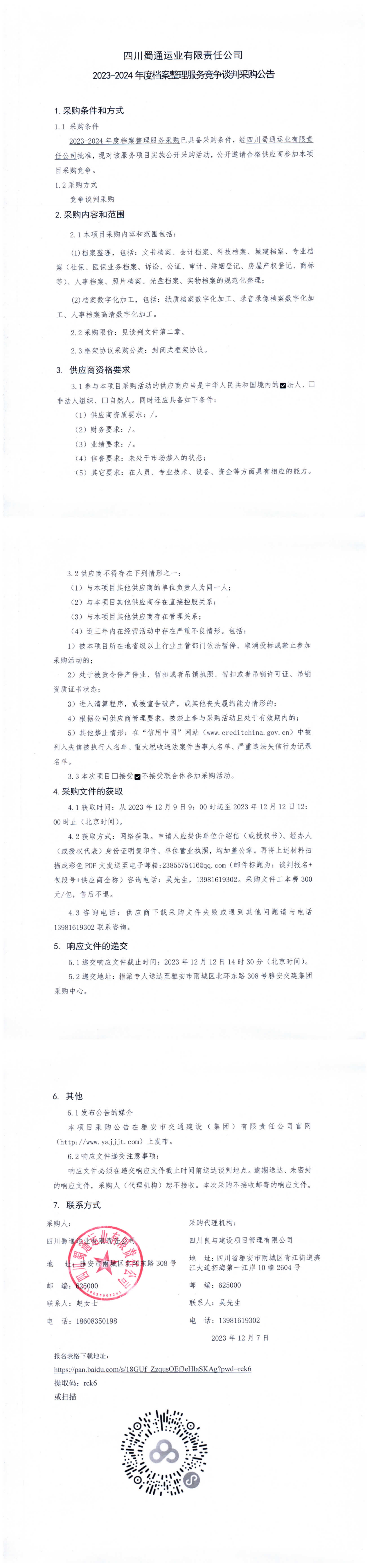 四川蜀通運業(yè)有限責(zé)任公司2023-2024年度檔案整理服務(wù)競爭談判采購公告