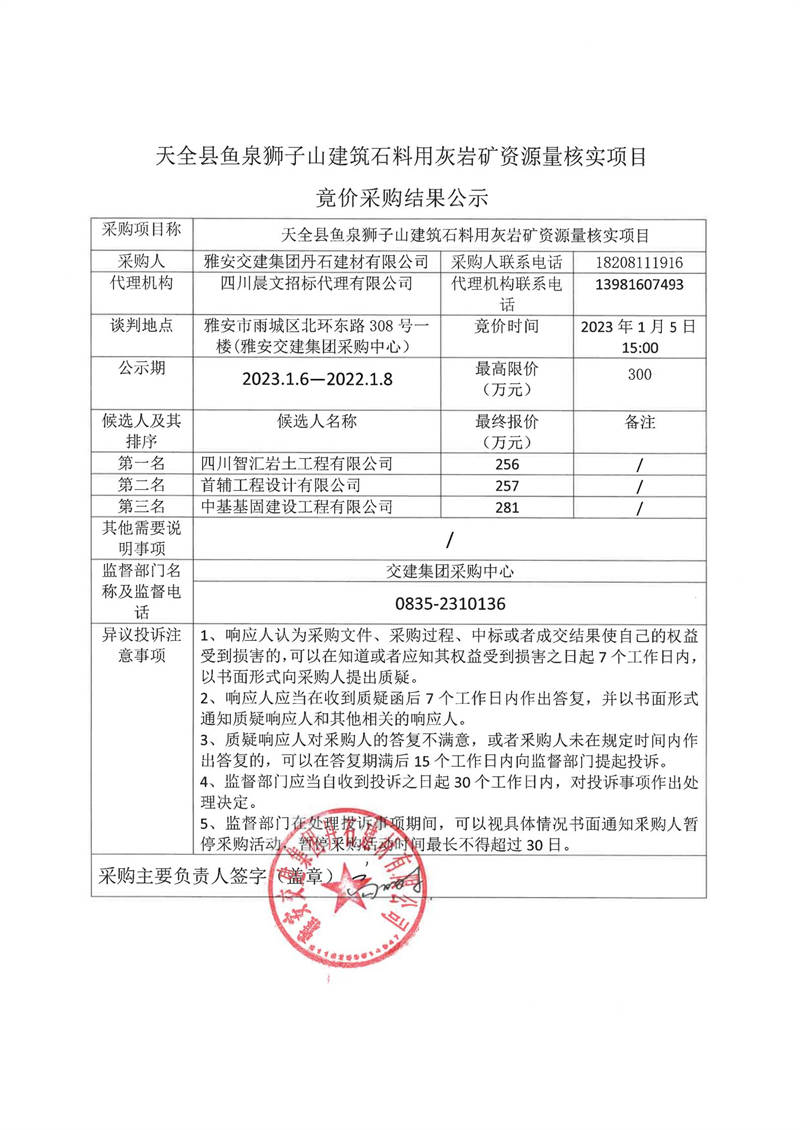 雅安交建集團丹石建材有限公司天全縣魚泉獅子山建筑石料用灰?guī)r礦資源量核實項目競價采購結(jié)果公示