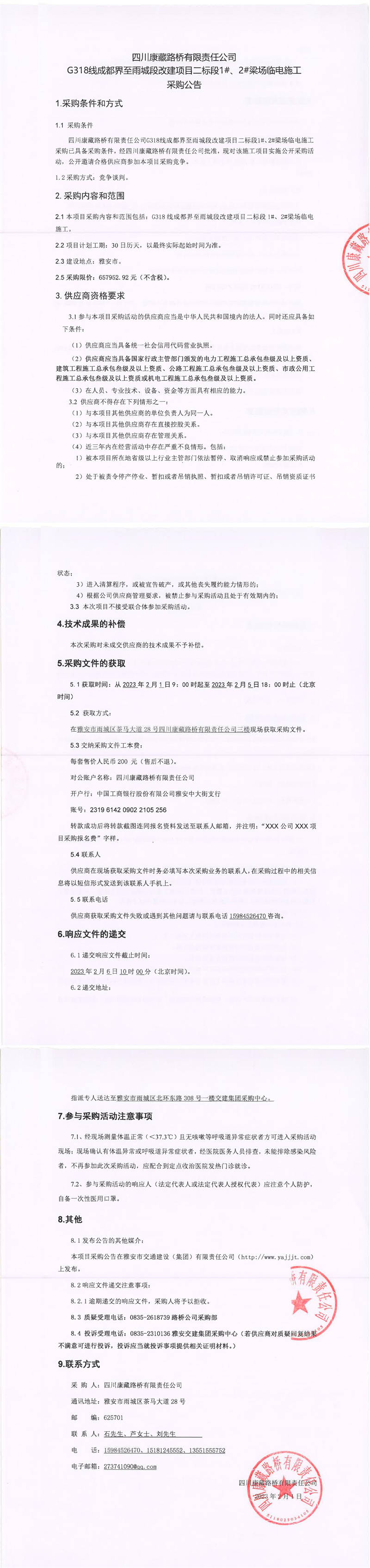 四川康藏路橋有限責(zé)任公司G318線成都界至雨城段改建項(xiàng)目二標(biāo)段1#、2#梁場(chǎng)臨電施工采購(gòu)公告