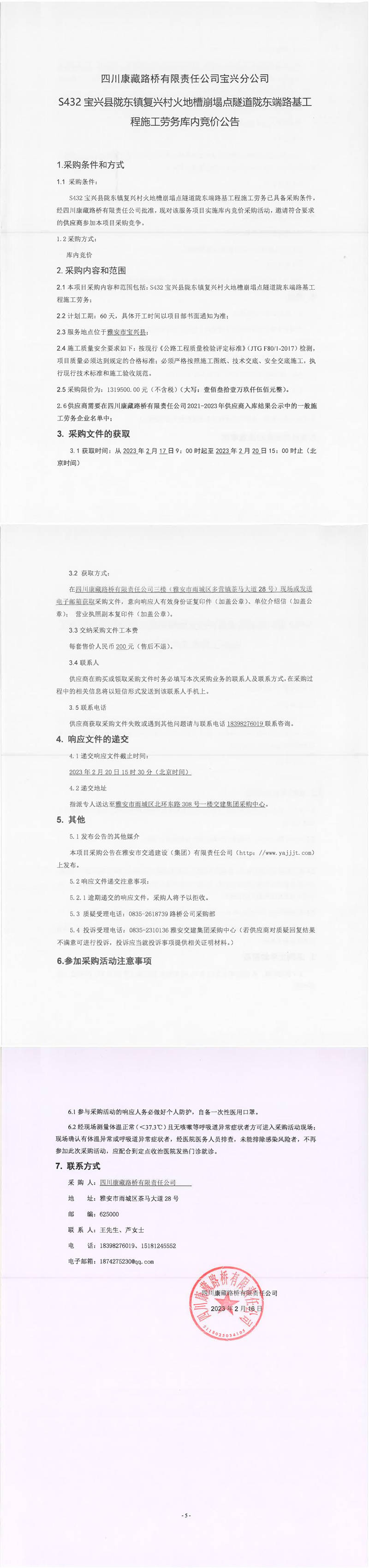 四川康藏路橋有限責(zé)任公司S432寶興縣隴東鎮(zhèn)復(fù)興村火地槽崩塌點(diǎn)隧道隴東端路基工程施工勞務(wù)庫內(nèi)競(jìng)價(jià)公告