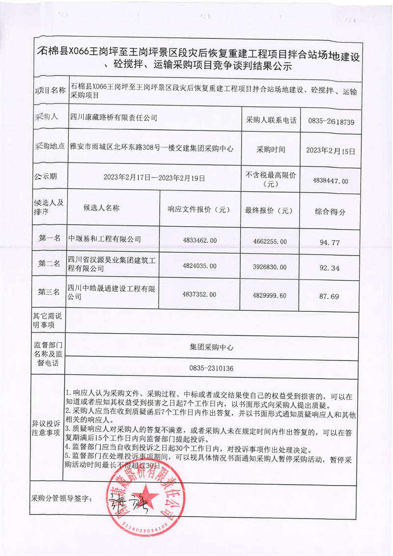 四川康藏路橋有限責(zé)任公司石棉縣X066王崗坪至王崗坪景區(qū)段災(zāi)后恢復(fù)重建工程項目拌合站場地建設(shè)、砼攪拌、運(yùn)輸采購項目競爭談判結(jié)果公示