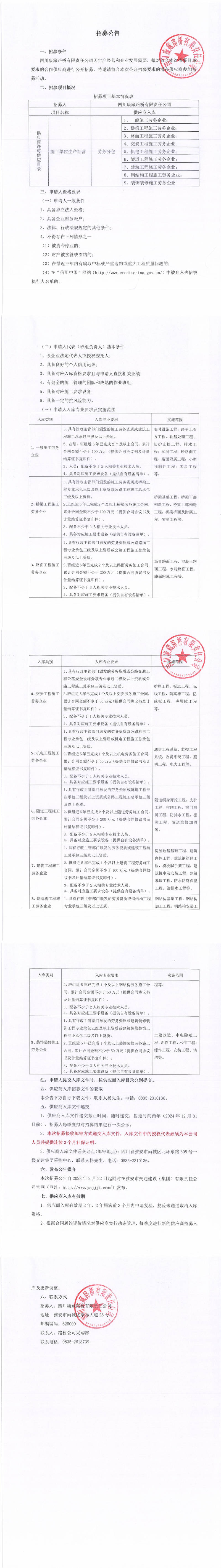 四川康藏路橋有限責任公司2023年供應商入庫(施工單位生產經營勞務分包)招募公告