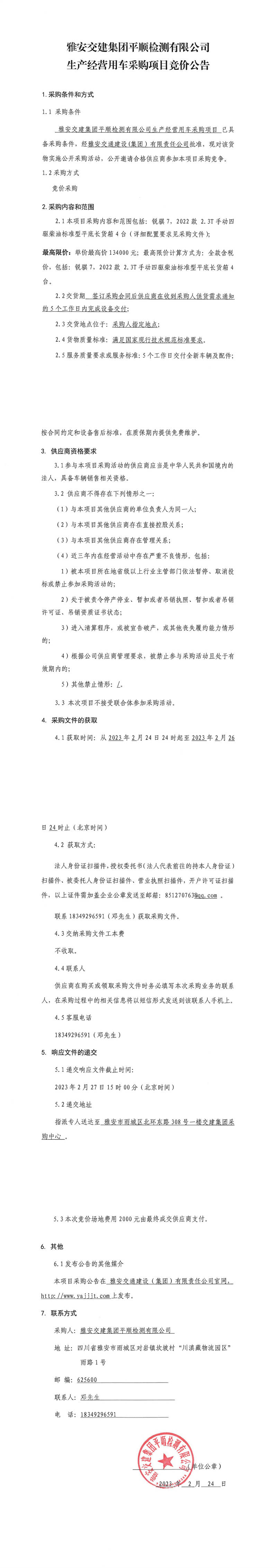 雅安交建集團(tuán)平順檢測有限公司生產(chǎn)經(jīng)營用車采購項(xiàng)目競價(jià)公告