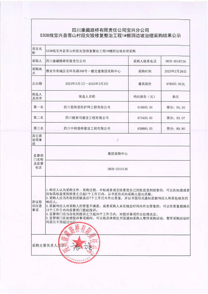 四川康藏路橋有限責任公司寶興分公司S308線寶興縣雪山村段災毀修復整治工程1#棚洞邊坡治理采購結(jié)果公示