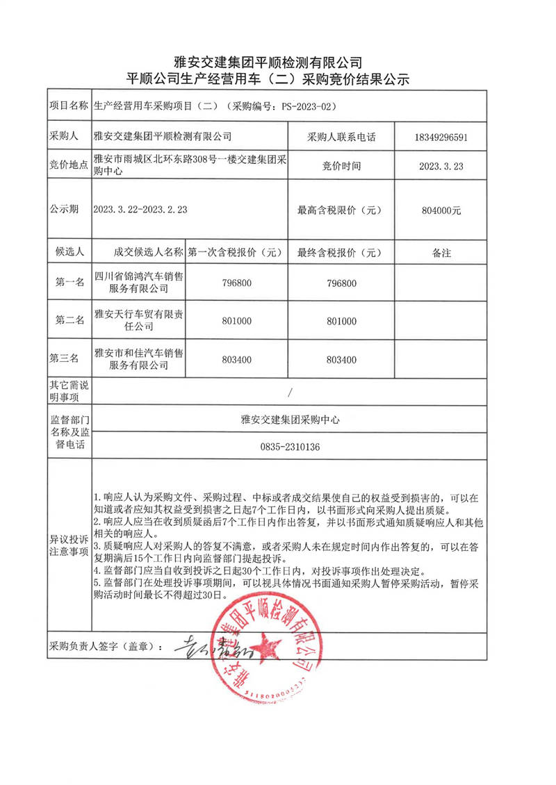 雅安交建集團平順檢測有限公司平順公司生產(chǎn)經(jīng)營用車(二)采購競價結(jié)果公示