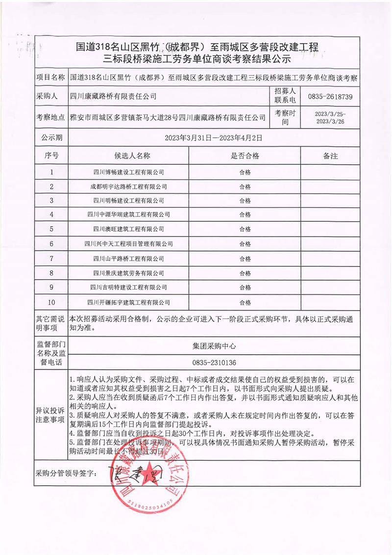 四川康藏路橋有限責(zé)任公司國道318名山區(qū)黑竹(成都界)至雨城區(qū)多營段改建工程三標段橋梁施工勞務(wù)單位商談考察結(jié)果公示