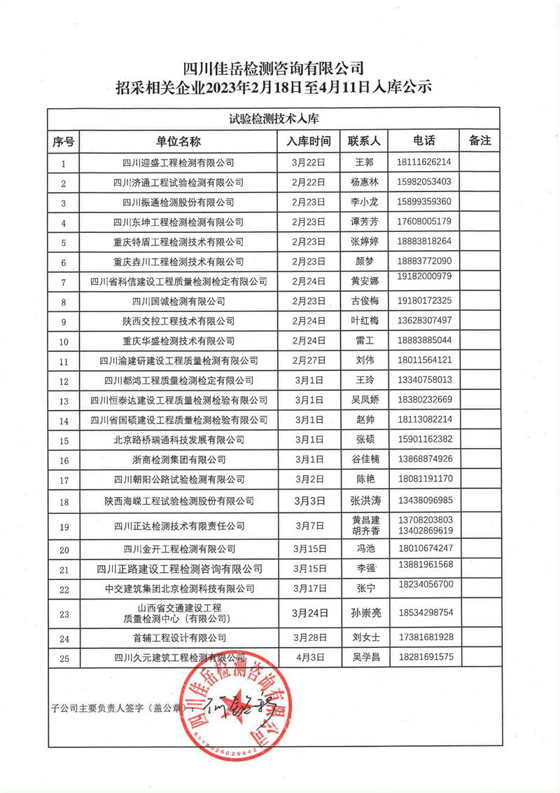 四川佳岳檢測(cè)咨詢有限公司(試驗(yàn)檢測(cè)勞務(wù)供應(yīng)商庫(kù))2023年2月18日至4月11日入庫(kù)結(jié)果公示