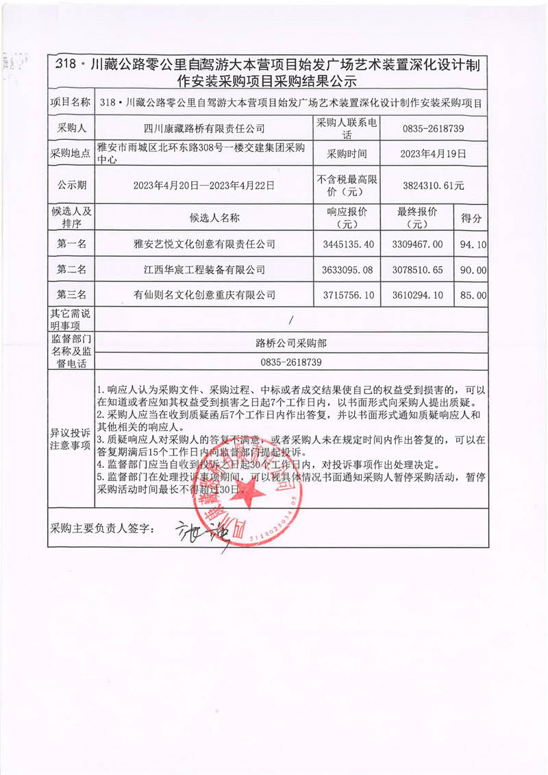 四川康藏路橋有限責(zé)任公司318·川藏公路零公里自駕游大本營項(xiàng)目始發(fā)廣場藝術(shù)裝置深化設(shè)計(jì)制作安裝采購項(xiàng)目采購結(jié)果公示