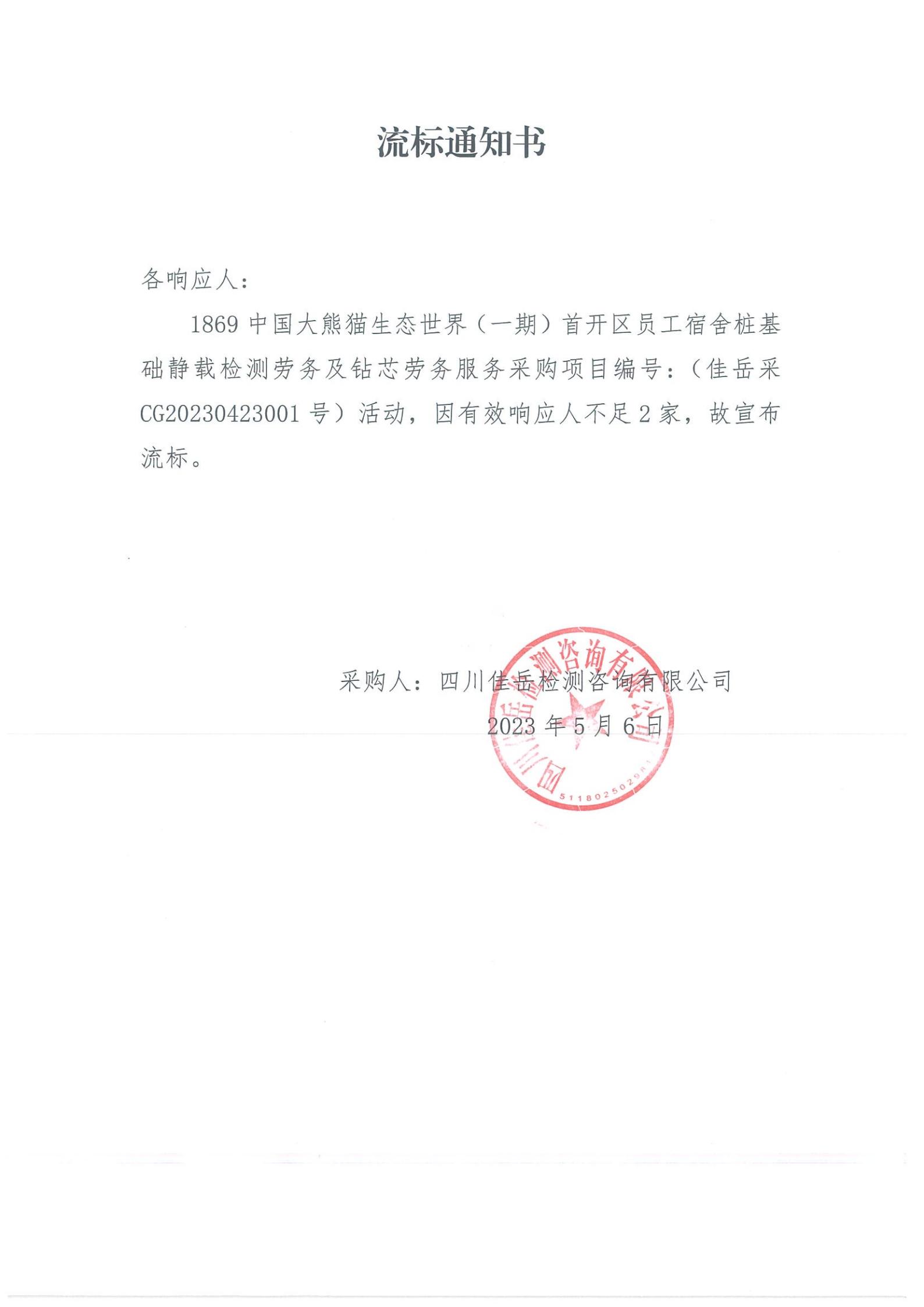 四川佳岳檢測咨詢有限公司1869中國大熊貓生態(tài)世界(一期)首開區(qū)員工宿舍樁基礎(chǔ)靜載檢測勞務(wù)及磚芯庫勞務(wù)服務(wù)流標(biāo)通知