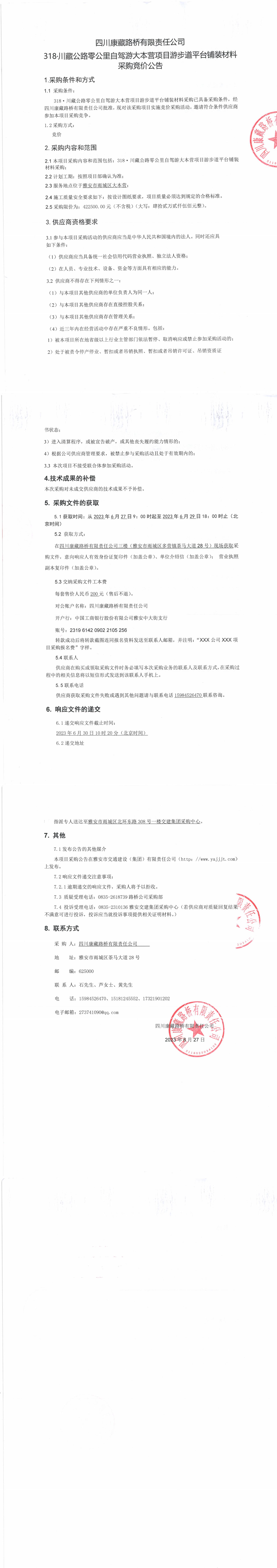 四川康藏路橋有限責任公司318·川藏公路零公里自駕游大本營項目步游道平臺鋪裝材料采購競價公告