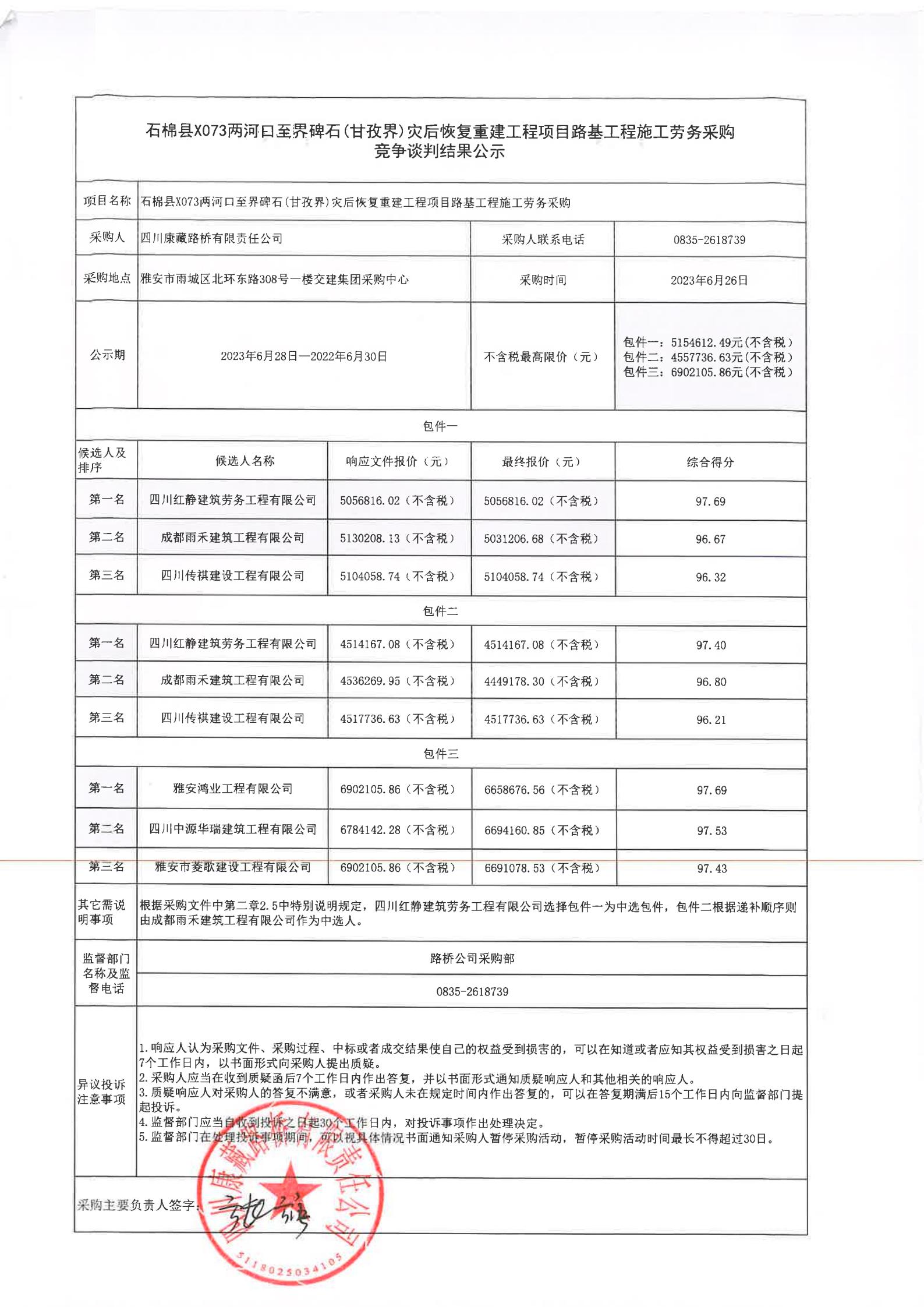 四川康藏路橋有限責任公司石棉縣X073兩河口至界碑石(甘孜界)災后恢復重建工程項目路基工程施工勞務采購競爭談判結果公示