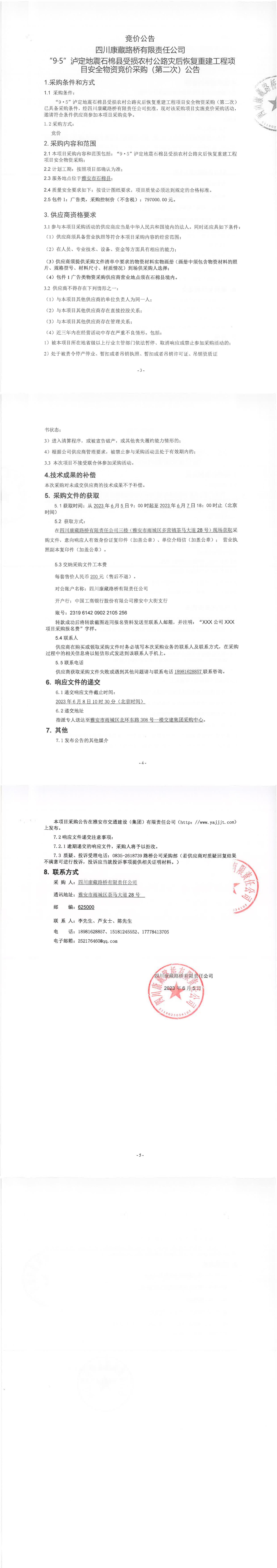 四川康藏路橋有限責任公司“9·5”瀘定地震石棉縣受損農(nóng)村公路災后恢復重建工程項目安全物資競價采購(第二次)公告