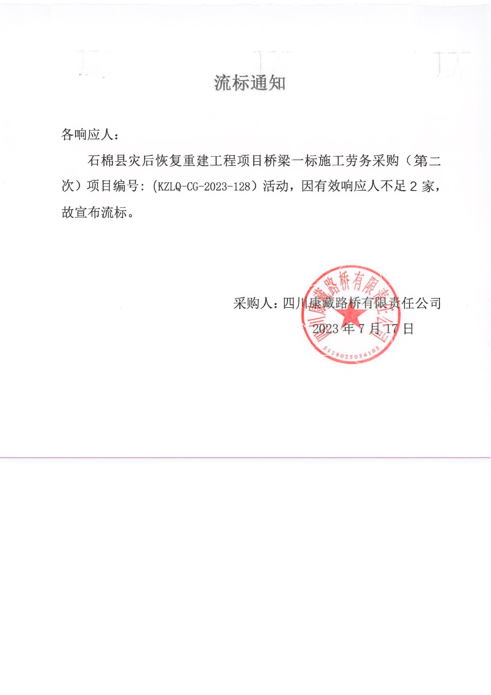 四川康藏路橋有限責(zé)任公司石棉縣災(zāi)后恢復(fù)重建工程項目橋梁一標段施工勞務(wù)采購(第二次)流標通知
