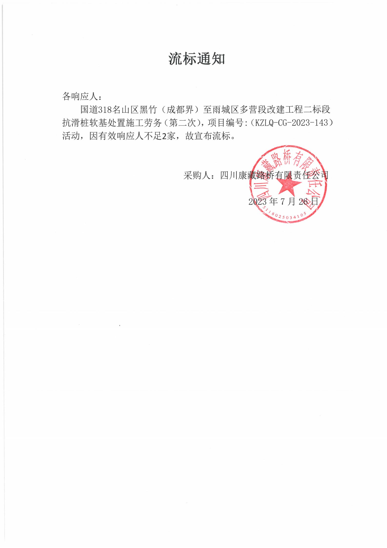 四川康藏路橋有限責任公司國道318名山區(qū)黑竹(成都界)至雨城區(qū)多營段改建工程二標段抗滑樁軟基處置施工勞務(wù)(第二次)流標通知