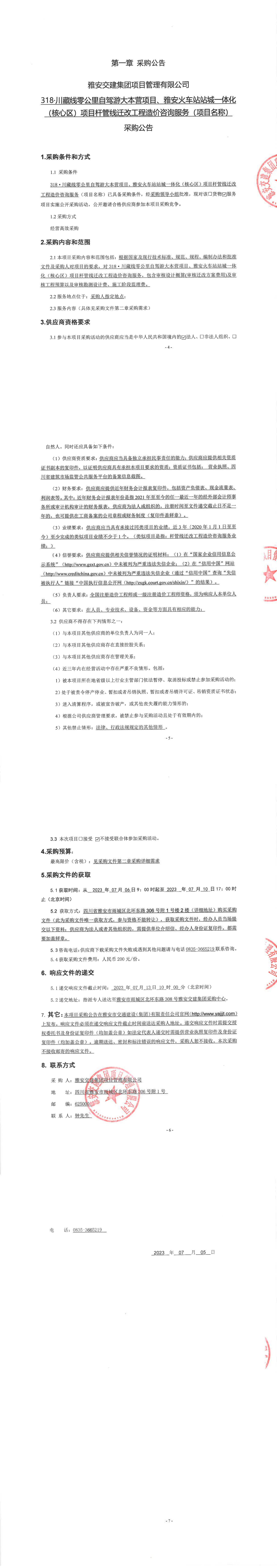 雅安交建集團(tuán)項目管理有限公司318·川藏線零公里自駕大本營項目、雅安火車站站城一體化(核心區(qū))項目桿管線遷改工程造價咨詢服務(wù)(項目名稱)采購公告