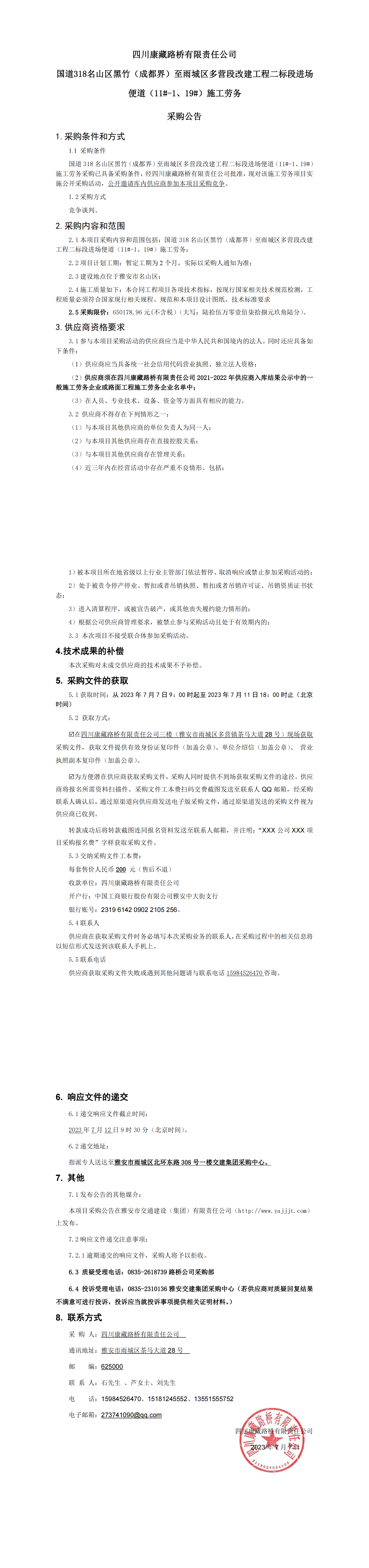 四川康藏路橋有限責(zé)任公司國(guó)道318名山區(qū)黑竹(成都界)至雨城區(qū)多營(yíng)段改建工程二標(biāo)段進(jìn)場(chǎng)便道(11#-1、19#)施工勞務(wù)采購(gòu)公告