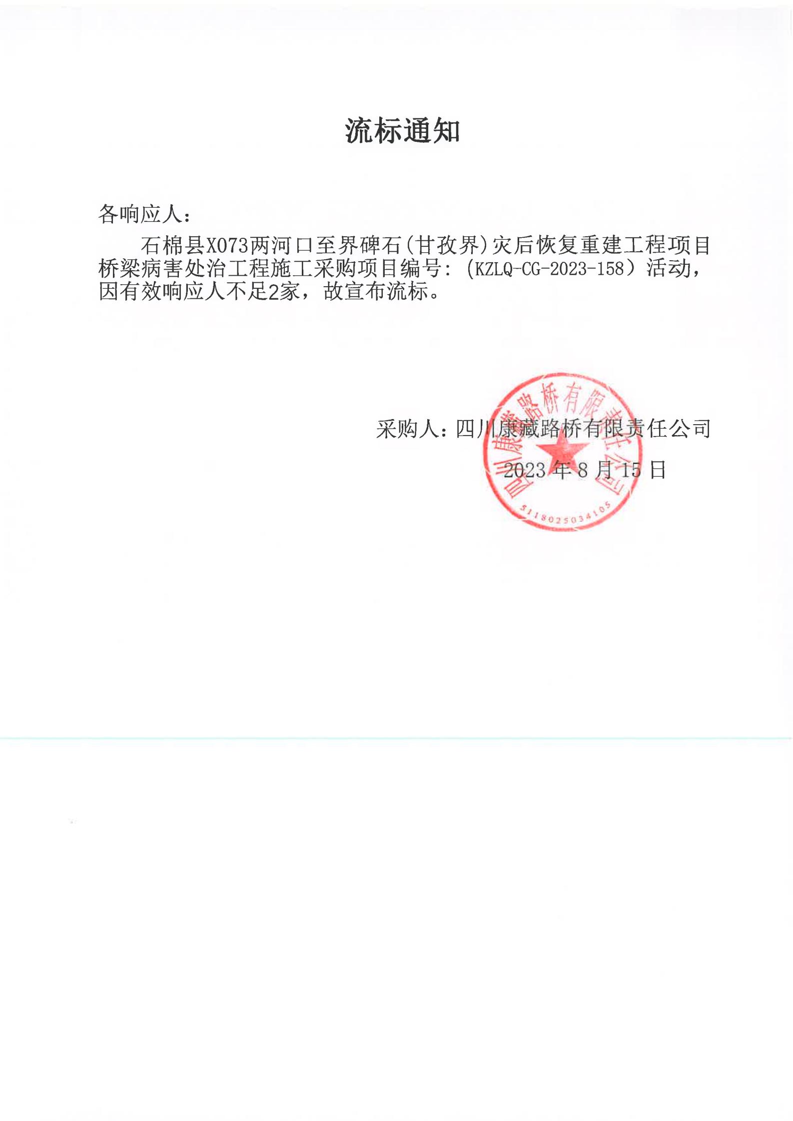 四川康藏路橋有限責任公司石棉縣X703兩河口至界碑石(甘孜界)災后恢復重建工程項目橋梁病害處治工程施工流標通知