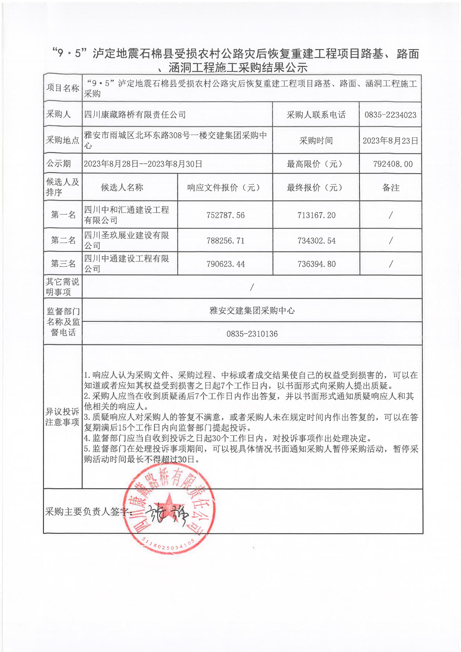 四川康藏路橋有限責(zé)任公司“9·5”瀘定地震石棉縣受損農(nóng)村公路災(zāi)后恢復(fù)重建工程項(xiàng)目路基、路面、涵洞工程施工采購結(jié)果公示