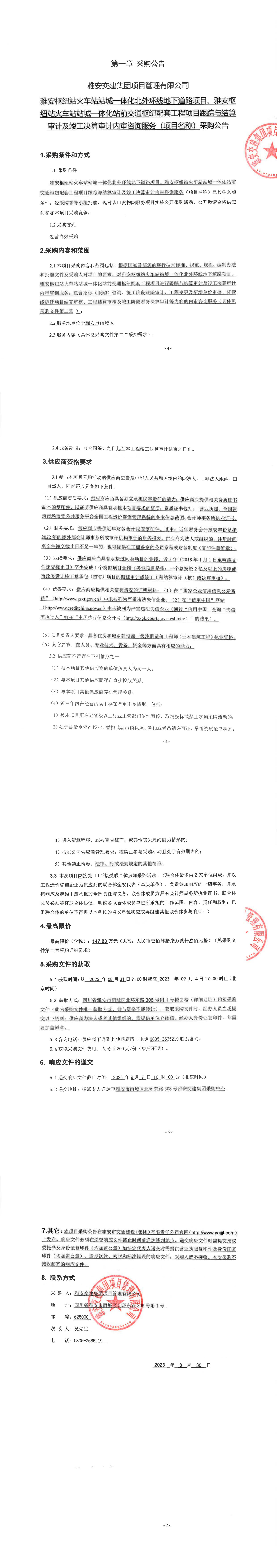 雅安交建集團(tuán)項(xiàng)目管理有限公司雅安樞紐站火車(chē)站站城一體化北外環(huán)線地下道路項(xiàng)目、樞紐站火車(chē)站站成一體化站前交通樞紐配套工程項(xiàng)目跟蹤與結(jié)算審計(jì)及竣工決算審計(jì)內(nèi)審咨詢(xún)服務(wù)(項(xiàng)目名稱(chēng))采購(gòu)公告